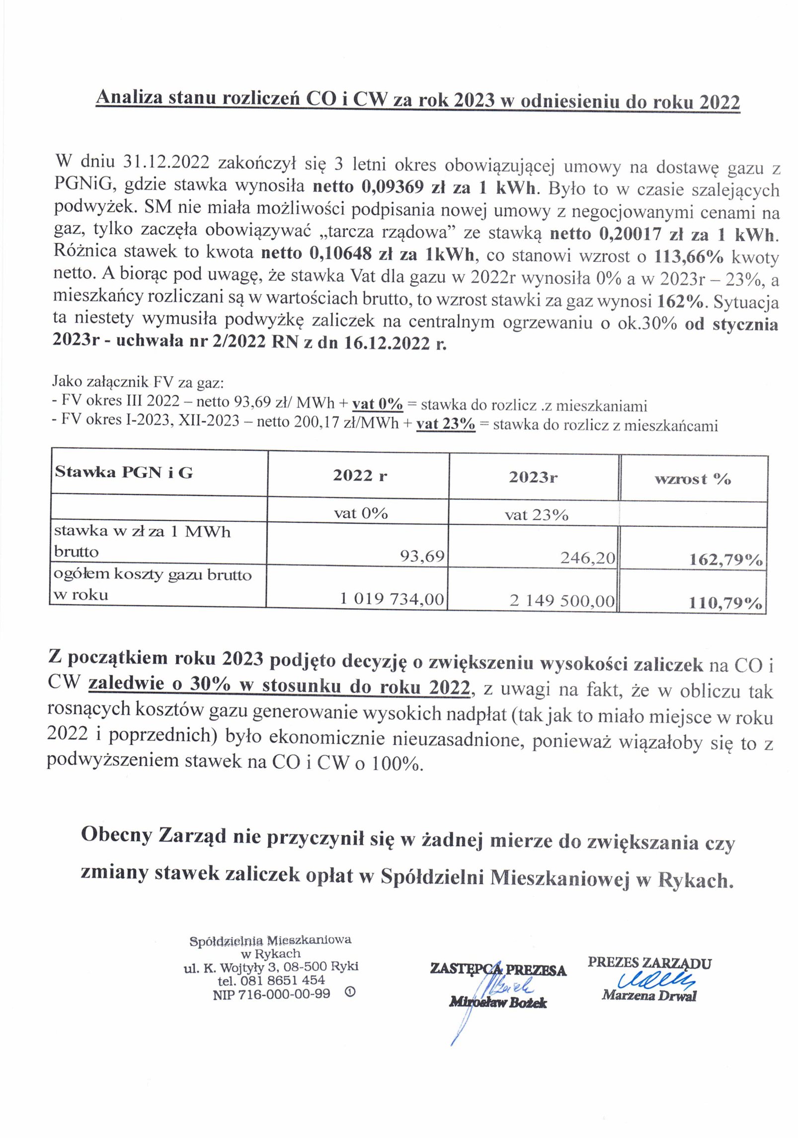 Analiza stanu rozliczeń CO i CW za rok 2023 w odniesieniu do roku 2022